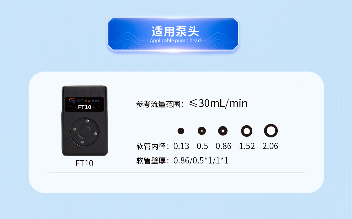 1.流量范圍:<30mL/min 2.控制與泵頭一體化設(shè)計,整體更加緊湊 3.上蓋與壓塊聯(lián)動機構(gòu),安裝軟管更方便 4.彈管壓塊,可適配多種軟管 5.步進電機驅(qū)動 6.透明觀察窗可方便查看泵頭運行狀態(tài) 7.開蓋傳感器(選裝):泵蓋打開,自動報警或:停止運行