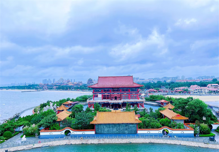 整個景區漂浮在大海上,景中有海,海中有景,內外海水相連,點點漁帆與岸邊景色相映成趣;玉樓仙閣,祥云繚繞;亭臺軒榭,步移景異;踏圍廊幽徑,臨海國信風,聽漁歌唱晚,觀碧波靈光,詩情畫意,不勝陶然。
